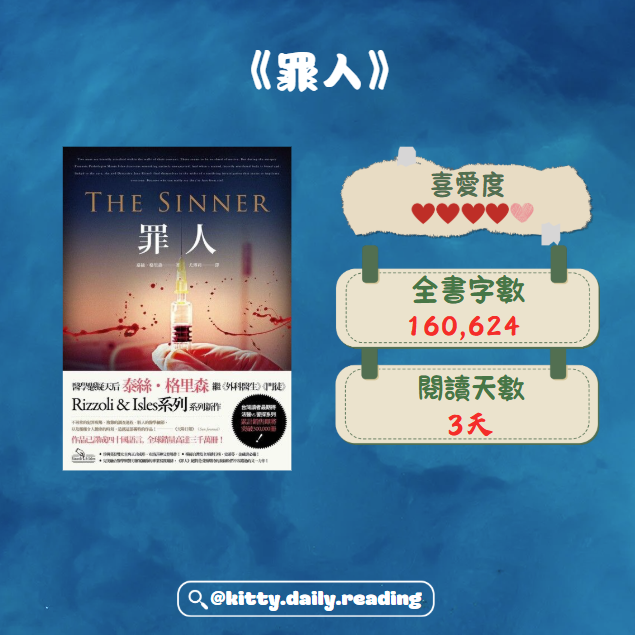 泰絲格里森的小說基本上都好看,而我一直追開的瑞卓利莫拉系列更像是老朋友,與一般查案小說不同的是,這系列都對女主角的私生活有非常詳盡的描寫,焦點除了落在懸疑的案件身上,還在於兩個女主角的成長,每一本都讓讀者對兩個女主角有更深入的了解。 《罪人》屬於系列的第三本,不過我已經看了很多這糸列之後的作品,對於這兩…