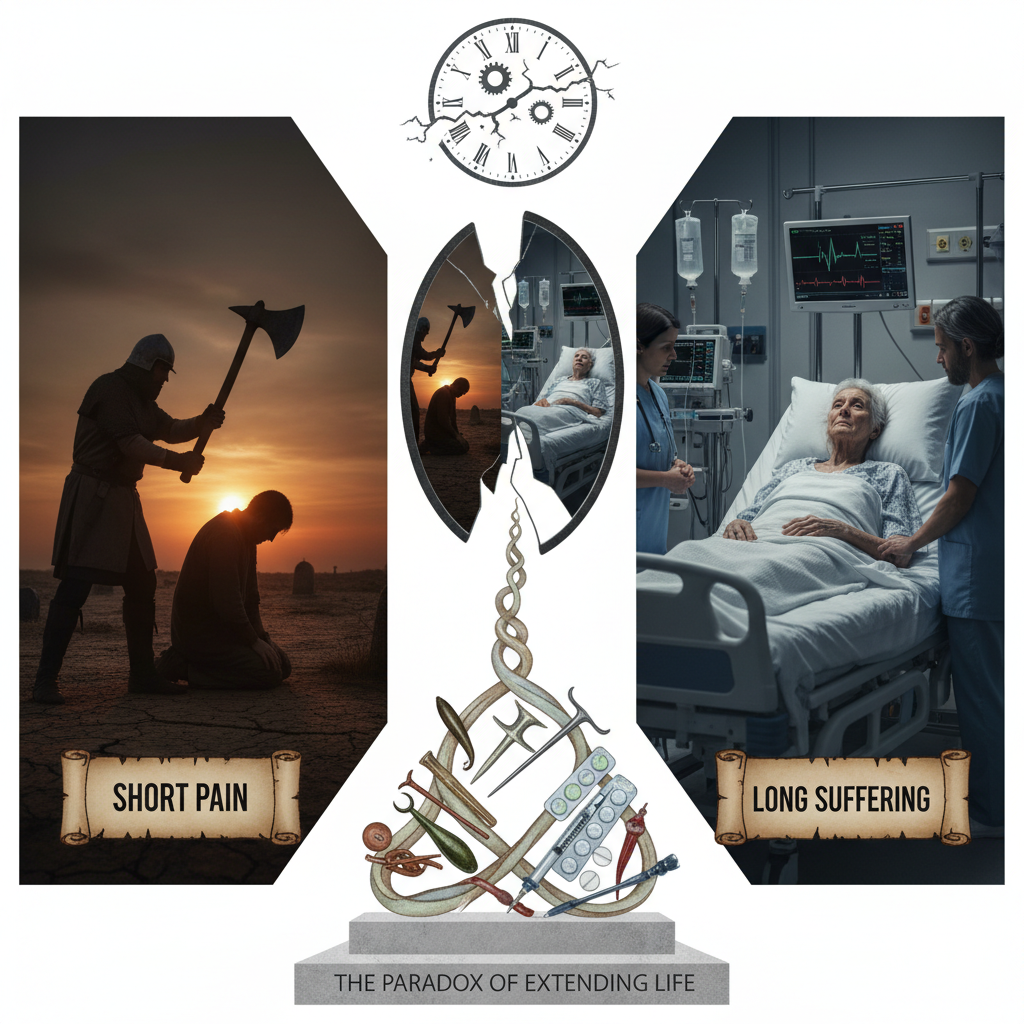 短暫的死亡與漫長的折磨 在人類歷史上,死亡往往來得迅速而直接。古代的人,如果感染疾病或受了重傷,很快就結束生命——這是「短痛」的死亡。對當時的人來說,活到中年甚至老年,本身就是幸運。死亡短暫而直接,痛苦雖大,但迅速結束,慢性折磨罕見。 醫學革命與壽命延長 19世紀以降,醫學開始改變這個規則。公共衛生改善、細菌學建立、疫苗與消毒…