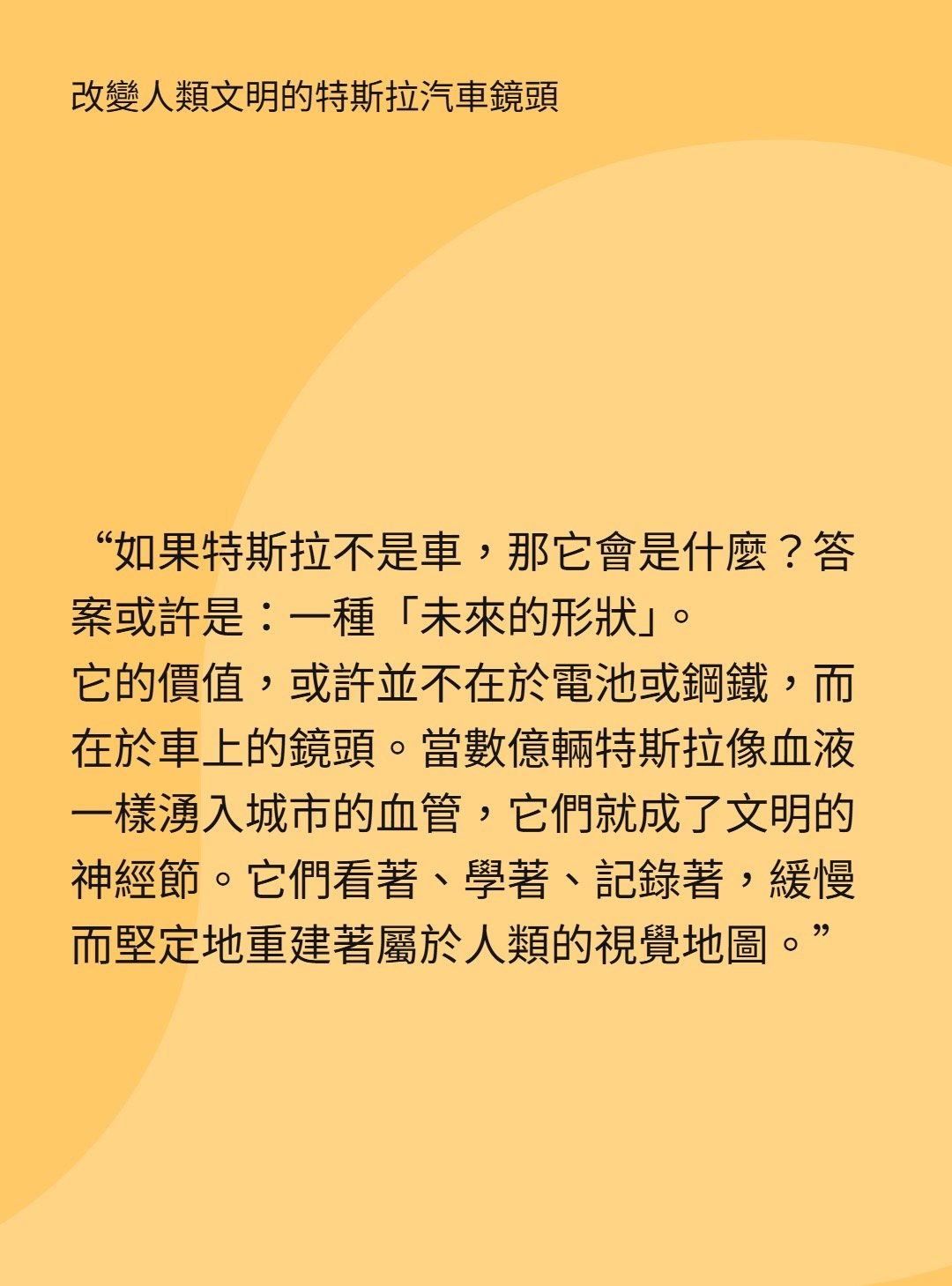 如果特斯拉不是車,那它或許是「未來的形狀」。它的價值不在電池與鋼鐵,而在遍布車身的鏡頭。當數億輛特斯拉如血液般流入城市血管,它們成為文明的神經節,看著、學著、記錄著,緩慢重建人類的視覺地圖。未來的人類回顧歷史,將看到的不只是文字,而是特斯拉鏡頭捕捉的最真實二十一世紀。我們正步入一個由視覺定義的新紀元,深陷其中,無…