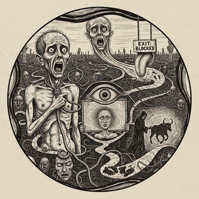 黑夜裡米諾陶走進了我的迷宮 繩索的一端綑綁著消失的腳印 另一端從掛滿在牆上顫抖的面容中長出 我從出口尋找佈滿血痕的入口 我陷在旋渦裡的巨大眼眶中 他拿著一面鏡子放在另一面鏡子之前 我的面容滲出了他的汗水 洶湧湍急響應著克萊因瓶內的呼喚 光從不屬於白天的地方冒了出來 我從不能睜開的眼睛看到了要走的路…