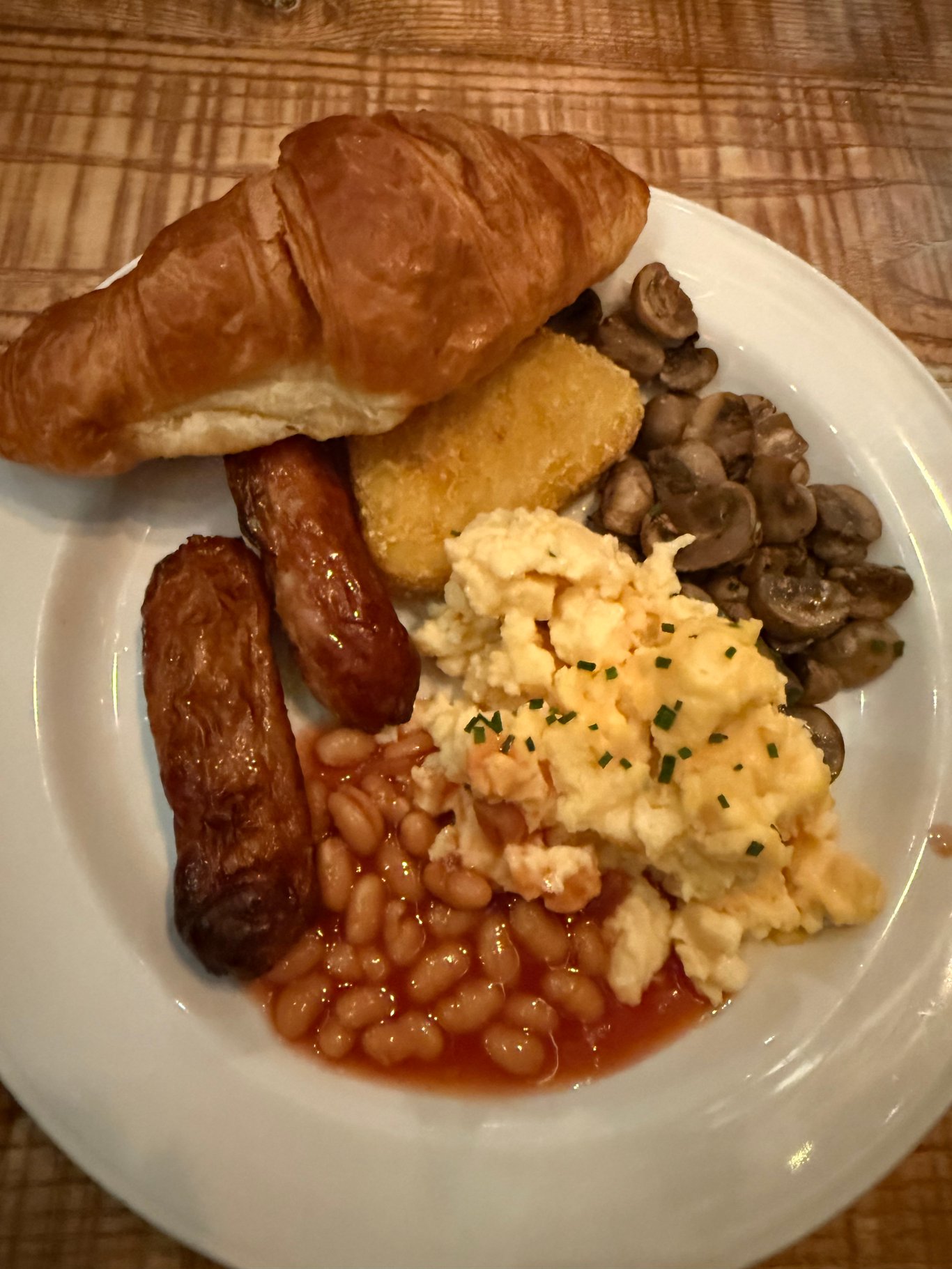 2025.12.29 06:32am 一開始來英國我是不吃豆子的,black pudding 我也不吃,後來漸漸的我也開始拿麵包沾豆子吃了,咬上一兩口black pudding ,似乎也不抗拒了。喝著熱熱的茶吃著一大盤英式早餐,人都是在一次又一次的試驗中習慣新的文化生活。 我們這一次住在山邊的旅館,天還未亮,看起來背景是深到海底的藍,讓我想起清境農場那些看起來假歐式的建築。我喜…