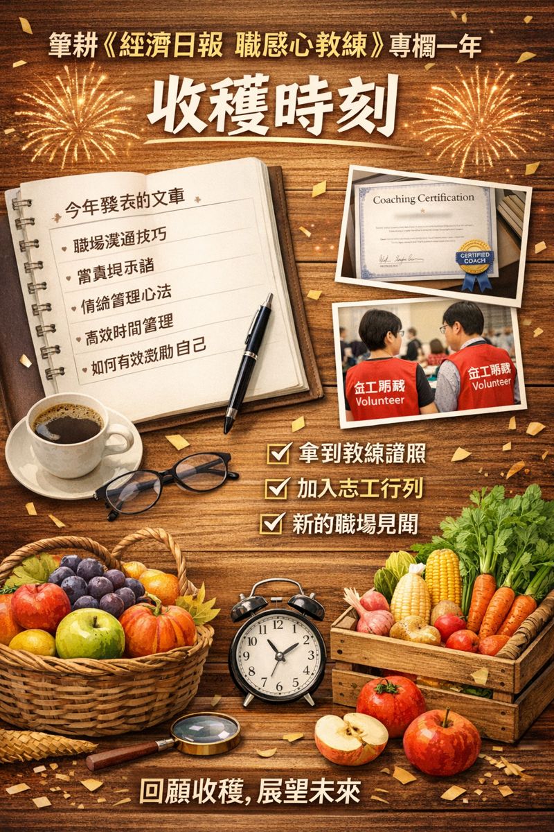 又是完整筆耕經濟日報⟪職感心教練⟫專欄一年了,到了收穫時刻,細數一下今年發表過的文章;工作上也有了一些新的見聞,還拿到教練證照並加入志工行列,現在就來盤點一下今年的收穫。