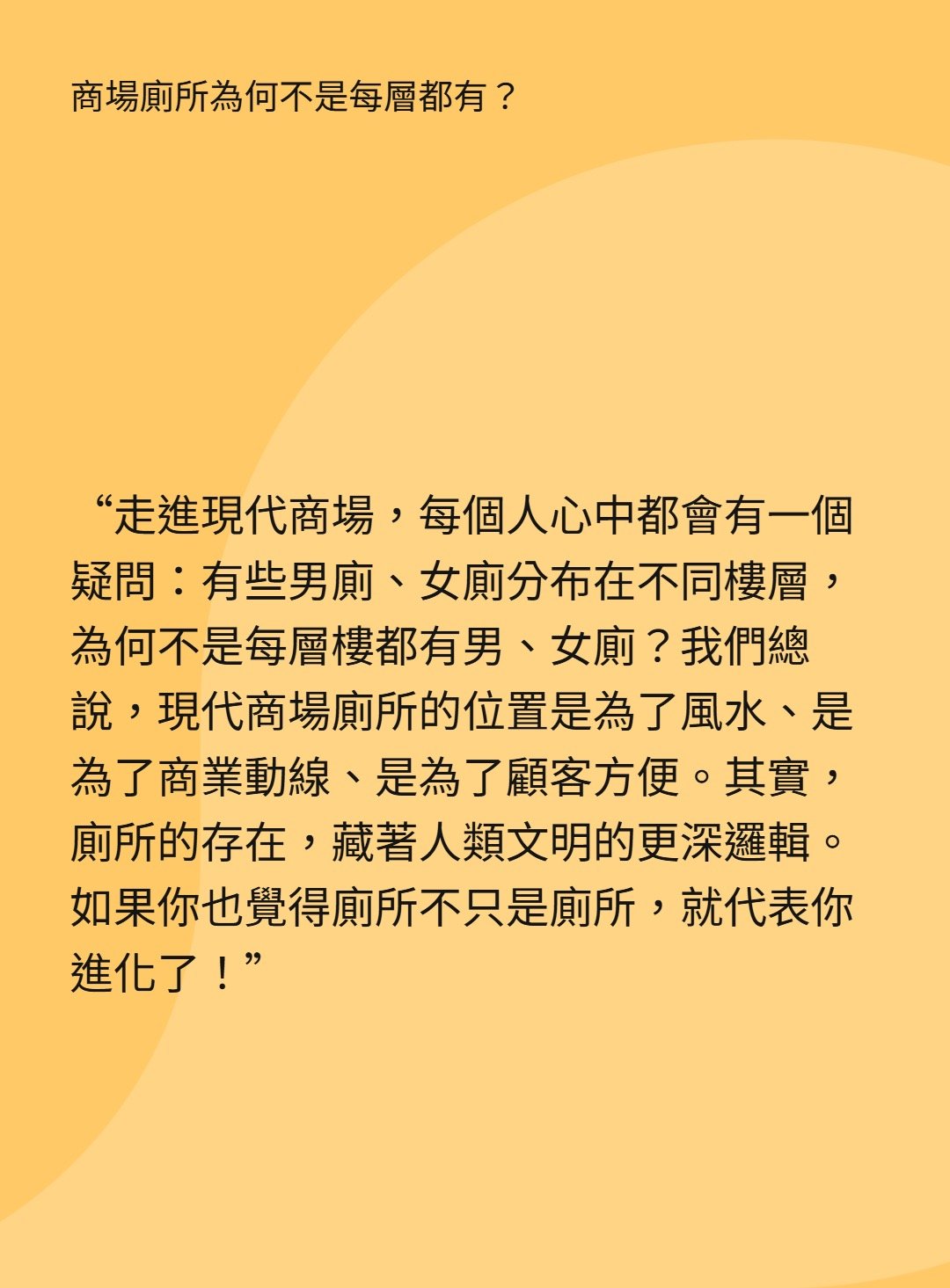 走進現代商場,每個人心中都會有一個疑問:有些男廁、女廁分布在不同樓層,為何不是每層樓都有男、女廁?我們總說,現代商場廁所的位置是為了風水、是為了商業動線、是為了顧客方便。其實,廁所的存在,藏著人類文明的更深邏輯。如果你也覺得廁所不只是廁所,就代表你進化了!