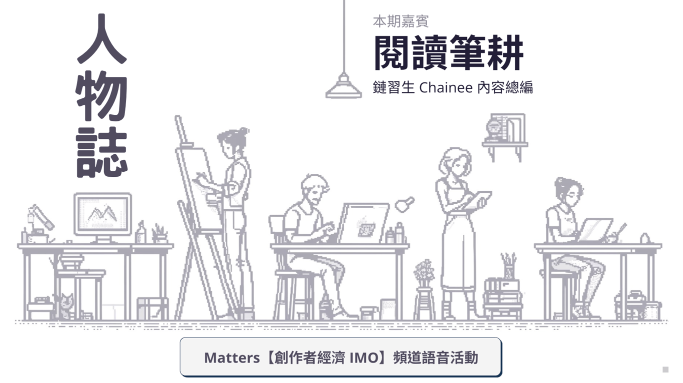 嗨!我是本週【創作者經濟 IMO】電子報的主編閱讀筆耕,目前和雨果.Hugo每雙週輪值一次編輯,帶你一起回顧本週精選文章(每週一上午 6 點派報)。也歡迎大家一起來「Matters 創作者經濟討論區」即時交流。 訂閱【創作者經濟 IMO】電子報,每週一上午六點迎接創作美好時光。 電子報是以 Heptabase 編輯,免費試用 7 天,和我們一起寫下 IMO。 這份電子報每週精選數則「Matters 創作…
