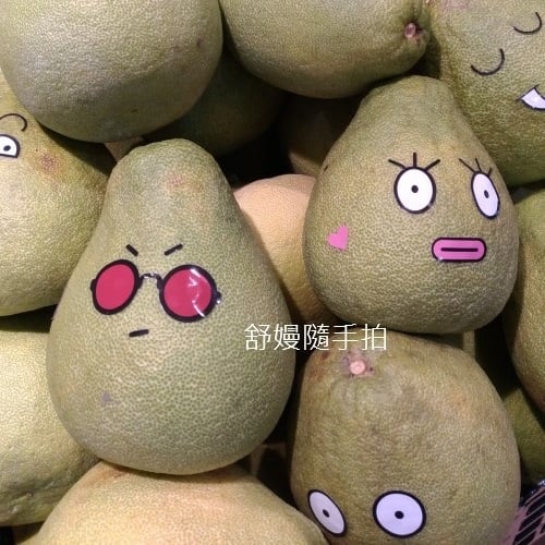 這是暑假時,在公車站牌拍到高掛樹梢的柚子。 前幾天看到超市水果區還有這麼多柚子。 可能是為了中秋節應景,替柚子貼了表情符號,節日已遠, 柚子家族仍成群結隊聚集等待青睞的人出現,帶它們回家。 感覺柚子們像是在冷宮永遠等不到皇上關愛眼神的後宮娘娘。 水果攤擺出蜜柚,據說果肉吃起來像葡萄柚,口感不酸,非常甜。