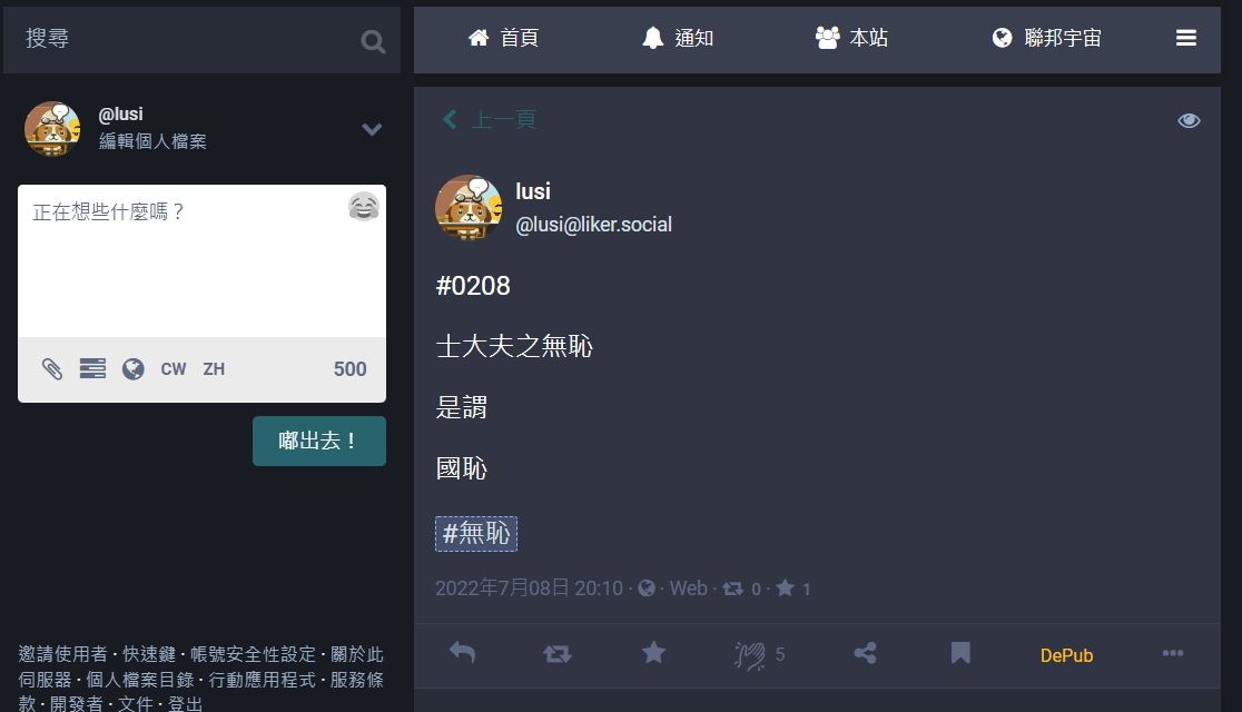 無恥4 篇文章舉步生瘋2023-01-30人無恥,則無敵人無恥,則無敵标签活跃作者Danielson在童話王國丹麥Danielson在童話王國丹麥喜歡旅行, 因家境貧窮,從不敢相信自己可以到國外旅行,甚至有天會住在國外。到夏威夷唸書的機會開拓了我人生視野和生活經驗。 從台灣到夏威夷﹐奧蘭多﹐紐約﹐Danielson 遇見了麥先生, 與他許下了下半輩子相知相守的誓言, 哥本哈根成了我第三個家。在這裡以平實的文字分享我人生的生活與愛情故事。舉步生瘋舉步生瘋本人樂觀開朗,身體健康,近期至未來五十年之人生規劃都已妥當,交友廣闊,身無隱疾,且家中尚有老父老母需奉養,絕無任何自殺輕生之意圖。 生活作息正常,更無機會接觸木炭、毒藥、槍砲彈藥等危險管制物品。 本人並無任何使我困擾之慢性病或心理疾病,故絕不可能做出任何看似自殺之行為。SAVSAVLusi2022-07-11迴力鏢大放送和國恥迴力鏢大放送和國恥相关标签lusi陸曦新人打卡逗趣乐趣SAV2021-12-24SAV的誕生就是一篇可能讓你感到無趣的自我介紹Danielson在童話王國丹麥2021-06-30竟有人這麼無恥??我真的不敢相信在 Matters 會有這麼無恥的人,在我之前的文章留言,因為一直不尊重的留一些政治挑釁留言,被我封鎖後,請他如果真想´討論政治議題,自己寫一篇文章,但沒想到他竟然幾乎完全抄襲我的文,還大言不慚直接發文,山寨大國果然名符其實。刷完啦