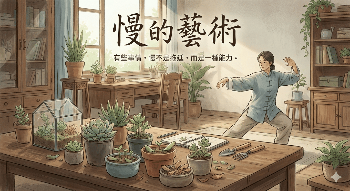 有些事情,慢不是拖延,而是一種能力。 我今年開始養多肉,也練太極拳。這兩件看似毫不相關的事情,卻讓我明白了同一個道理:慢下來,才能真正看懂、感受、掌握。 多肉的啟示 最初,我養多肉只是因為辦公室沒有陽台,全日照的植物養不起來。我挑了那種漂亮的生態瓶組合,擺在辦公桌上很好看,但後來才發現,每一顆多肉的生長方式都不同,有些根…