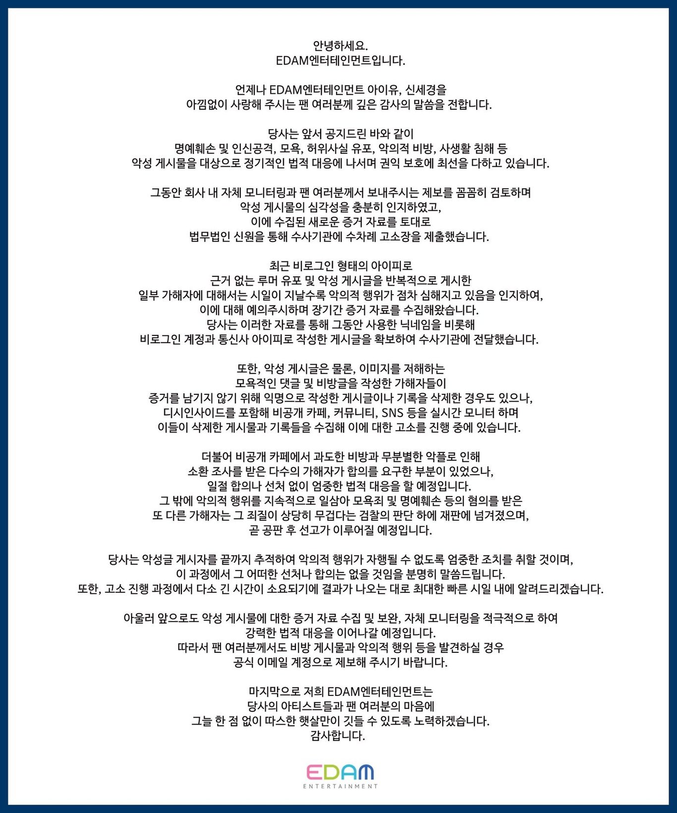 EDAM公告翻譯2 篇文章juinjuin韓生活2022-06-21【翻譯】EDAM公告(2022/6/21)這麼好的公司哪裡找ㅠㅠjuinjuin韓生活2022-01-21【分享】EDAM公告翻譯(2022/1/21)原文連結:【分享】EDAM公告翻譯(2022/1/21) juinjuin韓生活*EDAM為IU的經紀公司名稱 今天(1/21) EDAM在官方推特發了一張文章圖公告,內容很長,以下是公告圖的內容翻譯:原圖您好 這裡是EDAM娛樂。我們想對無論何時都毫無保留的喜愛著EDAM娛樂、IU、申世景的粉絲們表達崇高的謝意。相关标签明星偶像IU韓國追星IU守護團刷完啦