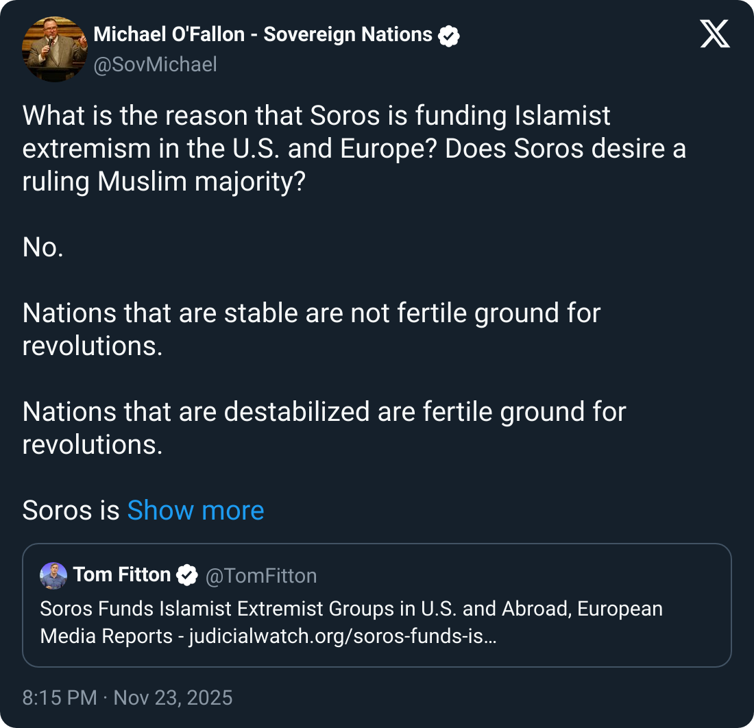 【推文】Michael O'Fallon - What is the reason that Soros is funding Islamist extremism in the U.S. and..