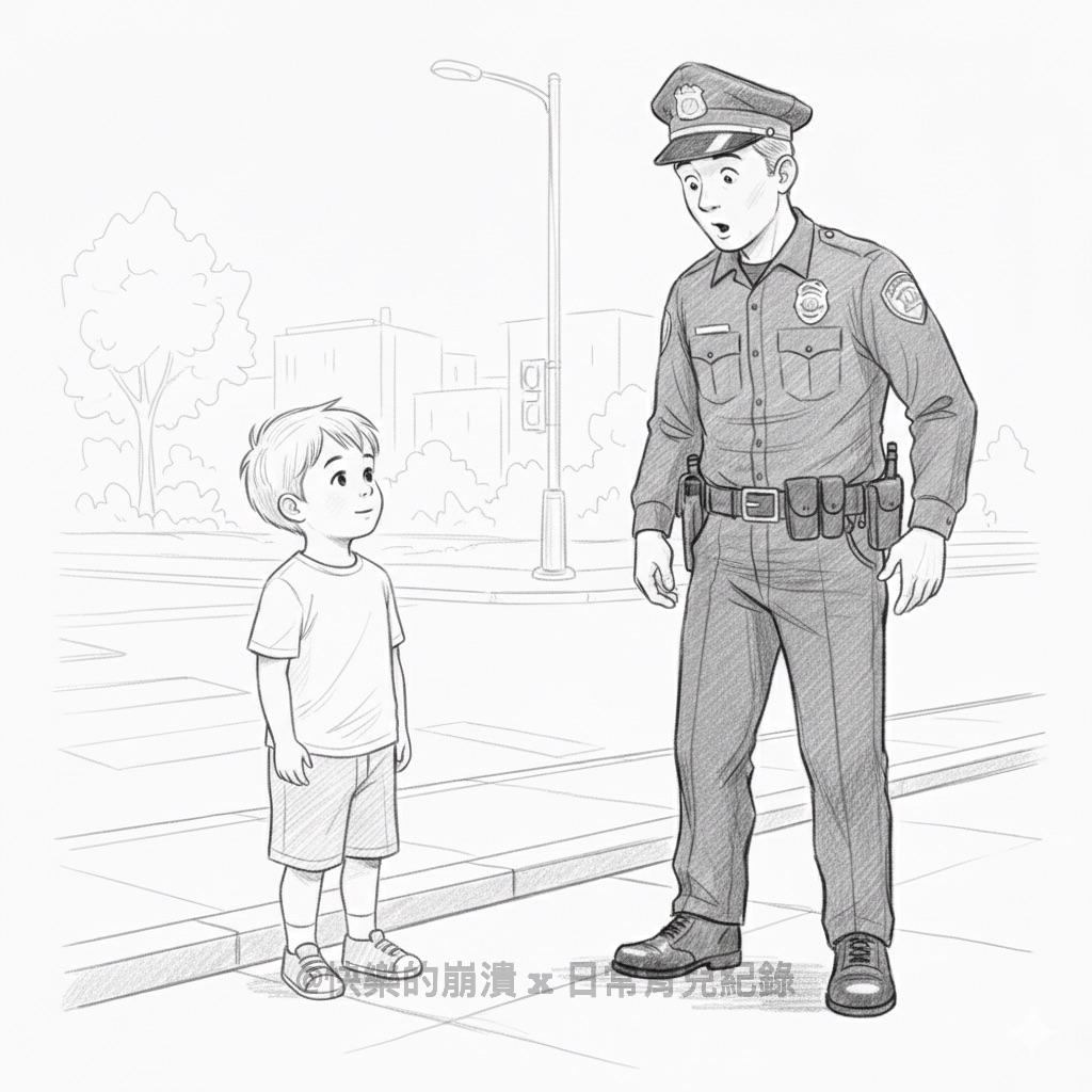 有陣子兒子很怕警察, 警察給他的印象大概就是可以把人抓走(?) 某天在公園正好遇到巡邏員警,嚇得躲到我身後 我蹲下看著他問:「你有做壞事嗎?」 他搖搖頭 我又說:「你沒有做壞事,為什麼要怕警察? 如果警察亂抓你,馬麻也會保護你,不會讓你被抓走!」 當晚睡前我對他說: 「平常馬麻是保護你的人,如果在外面找不到馬麻,警察叔叔就會代替馬麻來保…