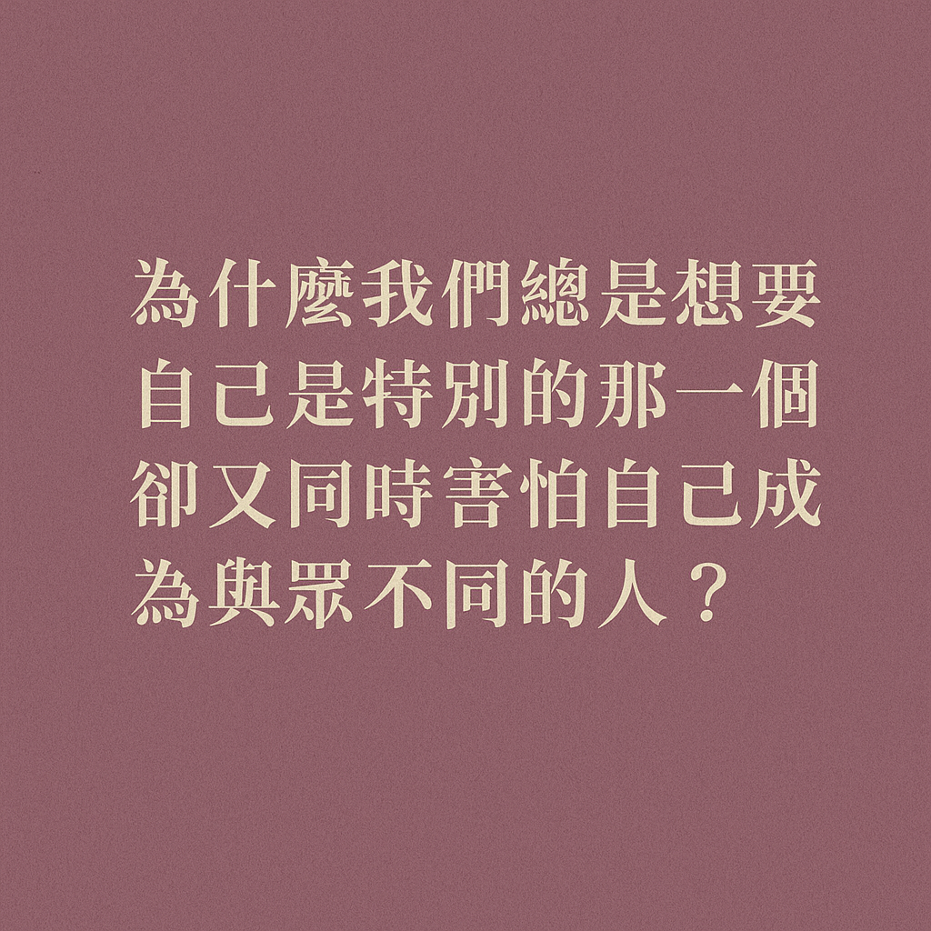 探討人類「渴望特別」卻又「害怕與眾不同」的矛盾心理,從心理學(馬斯洛、榮格)和社會學(從眾行為)角度剖析其根源,解釋這是追求價值感、存在感、被愛的需求,並探討如何透過面對與接納「陰影」,最終實現真正的自我價值與個體化。